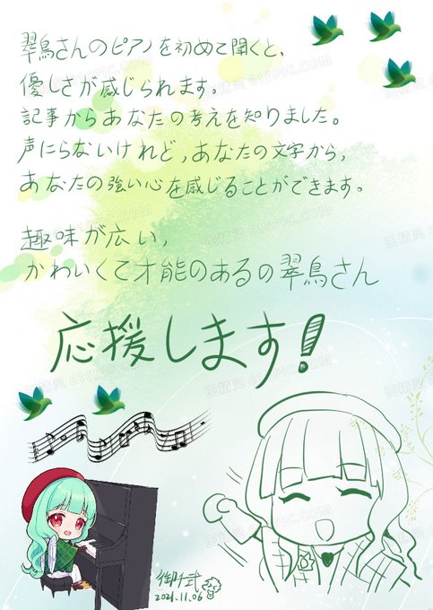 youtu.be/TI0AWVcTvAY 翠鳥さん、こんにちは ハスキーさんに紹介されて、会いに来ました。 本当にすみません、この時点では、まだ生放送は一度も見ていません。 (でももう2枚の絵を描きました。ww) (アーカイブを見ましたよ、とても綺麗なピアノの音です) #翠鳥リリ #バーチャルYouTuber #Vtuber