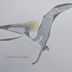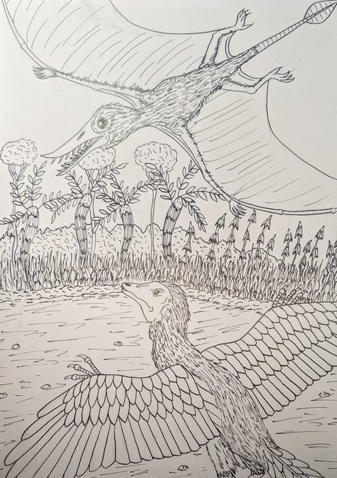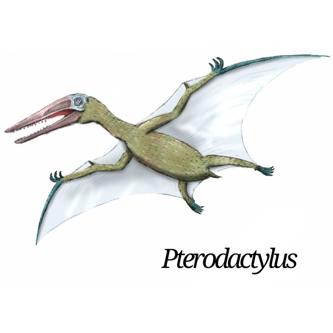 #恐竜イニシャル2 のpは #プテロダクティルス 。首に羽毛のこんせき。#翼竜 の種は大きく分けて2つ。小型で尾が長いランフォリンクス類そして、大型で尾がみじかく、頭でかいプテロダクティルス類。こちらは翼開長150㎝ほどで、この種にしてはちいさい。 #pterodactylus #古生物 #イラスト