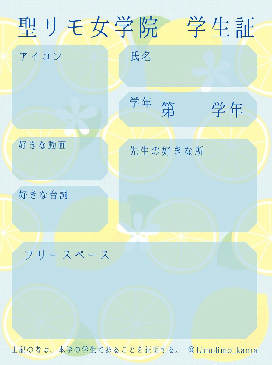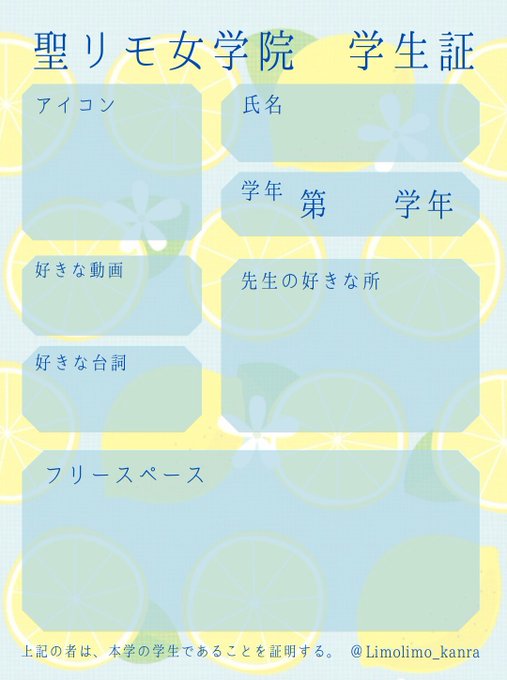 bntr自己紹介カードを羨ましく見ている🍋🚺のみんな!待たせたな! 聖リモ女学院学生証作っちゃいました!リモ女の皆様も、自己紹介カードで盛り上がりましょう💕✨ リプ欄に使用の際の注意事項を記載しておりますので、ご一読下さい。 #リモー絵先生 #聖リモ女学院 #リモ女自己紹介カード