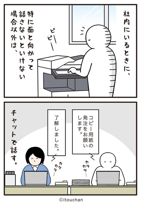 #マイナビニュース さまの「職場の謎ルール」という企画にて2コマ漫画を描かせていただきました✌️ news.mynavi.jp/series/nazorul… 第8回目は「社内にいるけど」対面じゃなくても良い同僚との会話は… 😲 #いとうちゃん #厭うちゃん #2コマ漫画 #職場の謎ルール #漫画が読めるハッシュタグ