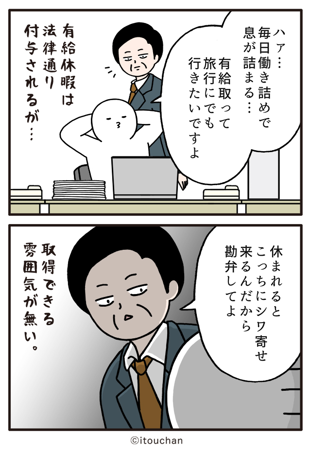 #マイナビニュース さまの「職場の謎ルール」という企画にて2コマ漫画を描かせていただきました✌️ news.mynavi.jp/series/nazorul… 第7回目は「勘弁してよ」有給休暇は付与されるけど…取得しづらい上司の一言😲 #いとうちゃん #厭うちゃん #2コマ漫画 #職場の謎ルール #漫画が読めるハッシュタグ #有給休暇