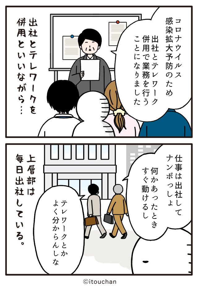 #マイナビニュース さまの「職場の謎ルール」という企画にて2コマ漫画を描かせていただきました✌️ news.mynavi.jp/series/nazorul… 第10回目は「出社とテレワークを併用」しかし上層部の方々は… 😲 #いとうちゃん #厭うちゃん #2コマ漫画 #職場の謎ルール #漫画が読めるハッシュタグ