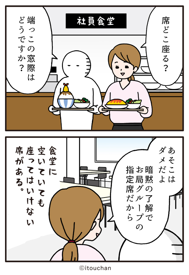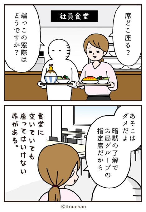 #マイナビニュース さまの「職場の謎ルール」という企画にて2コマ漫画を描かせていただきました✌️ news.mynavi.jp/series/nazorul… 第9回目は「あそこはダメだよ」ランチ時、社員食堂の空いてる席に座れない理由 😲 #いとうちゃん #厭うちゃん #2コマ漫画 #職場の謎ルール #漫画が読めるハッシュタグ