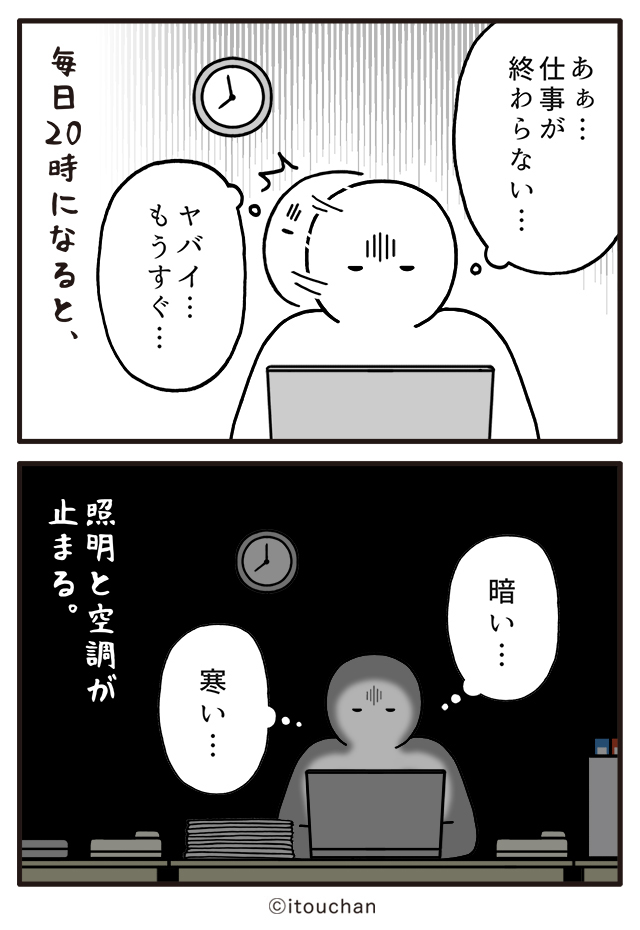 #マイナビニュース さまの「職場の謎ルール」という企画にて2コマ漫画を描かせていただきました✌️ news.mynavi.jp/series/nazorul… 第11回目は「ヤバい、もうすぐ…」20時すぎまで残業すると、絶望したくなる理由😲 #いとうちゃん #厭うちゃん #2コマ漫画 #職場の謎ルール #漫画が読めるハッシュタグ #節電