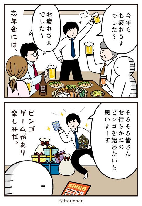 #マイナビニュース さまの「職場の謎ルール」という企画にて2コマ漫画を描かせていただきました✌️ news.mynavi.jp/series/nazorul… 第13回目は「皆さんお待ちかねの…」職場の忘年会、地味に楽しみなイベントとは? 😲 #いとうちゃん #厭うちゃん #2コマ漫画 #職場の謎ルール #漫画が読めるハッシュタグ