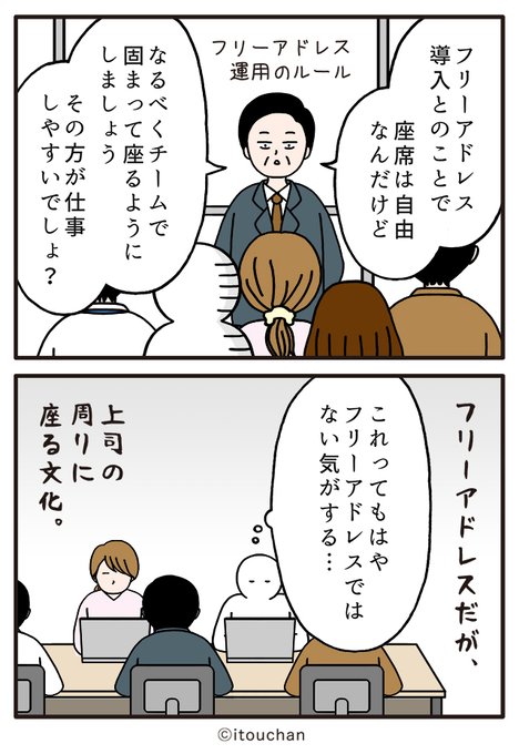 #マイナビニュース さまの「職場の謎ルール」という企画にて2コマ漫画を描かせていただきました✌️ news.mynavi.jp/series/nazorul… 第14回目は「座席は自由なんだけど」#フリーアドレス の全然フリーじゃないルール😲 #いとうちゃん #厭うちゃん #2コマ漫画 #職場の謎ルール #漫画が読めるハッシュタグ