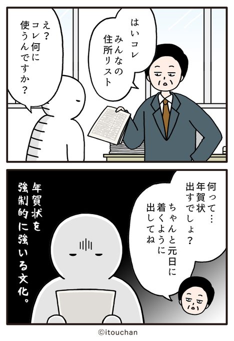 #マイナビニュース さまの「職場の謎ルール」という企画にて2コマ漫画を描かせていただきました✌️ news.mynavi.jp/series/nazorul… 第16回目は「コレ何に使うんですか?」年末に社員の住所リストを渡されたけど…😲 #いとうちゃん #厭うちゃん #2コマ漫画 #職場の謎ルール #漫画が読めるハッシュタグ #年賀状