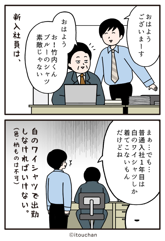 #マイナビニュース さまの「職場の謎ルール」という企画にて2コマ漫画を描かせていただきました✌️ news.mynavi.jp/series/nazorul… 第21回目は、ワイシャツの新入社員、「素敵だね」に続いて上司に言われた言葉とは? 😲 #いとうちゃん #厭うちゃん #2コマ漫画 #職場の謎ルール #漫画が読めるハッシュタグ