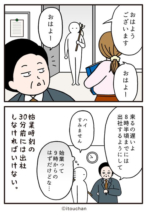 #マイナビニュース さまの「職場の謎ルール」という企画にて2コマ漫画を描かせていただきました✌️ news.mynavi.jp/series/nazorul… 第24回目は、出社早々「おはよう」のあとに上司にかけられた一言とは?😲 #いとうちゃん #厭うちゃん #2コマ漫画 #職場の謎ルール #漫画が読めるハッシュタグ #30分前出勤