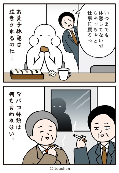 #マイナビニュース さまの「職場の謎ルール」という企画にて2コマ漫画を描かせていただきました✌️ news.mynavi.jp/series/nazorul… 第23回目は、なぜ? お菓子休憩は注意され、●●休憩は許されるという現実😲 #いとうちゃん #厭うちゃん #2コマ漫画 #職場の謎ルール #漫画が読めるハッシュタグ #タバコ休憩