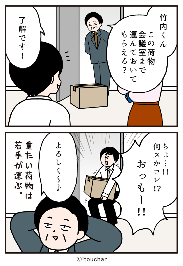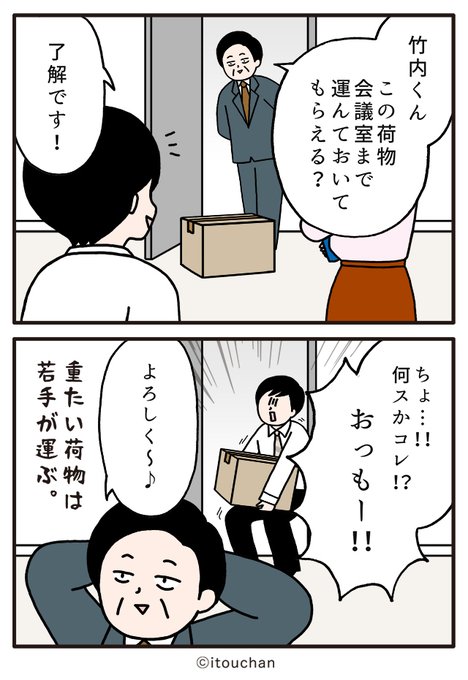 #マイナビニュース さまの「職場の謎ルール」という企画にて2コマ漫画を描かせていただきました✏️ news.mynavi.jp/series/nazorul… 第32回目はこの荷物運んでもらえる?」 "●●な荷物は若手が運ぶ"という暗黙ルール😮 #いとうちゃん #厭うちゃん #2コマ漫画 #職場の謎ルール #漫画が読めるハッシュタグ