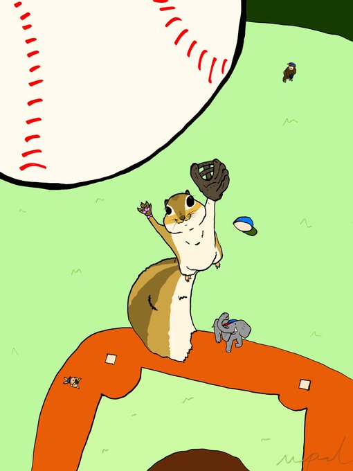肉球アニマルズ選手名鑑6 二塁手リス ボールより小さいので、ゴロ以外は一塁手の象さんに飛ばしてもらう 『スカイラブハリケーン』方式 でいかなる打球も逃さない 最近他球団から若干の苦情が湧き上がりつつあるが無視してる #肉球アニマルズ #絵描きさんと繋がりたい #イラスト好きな人と繋がりたい