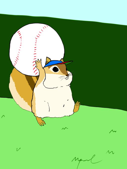 ボールより小さい身体だがほっぺにボールを隠す秘技『隠し球』をたまに使う それは審判に普通に怒られる あとボールの投げ方はサッカーのスローイン方式、遠投記録は球界最低の1m #肉球アニマルズ #絵描きさんと繋がりたい #イラスト好きな人と繋がりたい