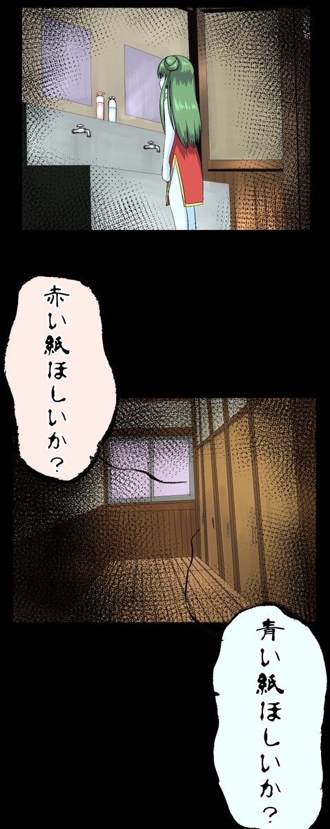 #肝潰しの夜 「赤い紙ほしいか?青い紙ほしいか?」 背後からの問いかけに、つい答えてしまった紫苑。 それは月ノ宮小学校に伝わる「赤い紙青い紙」という恐ろしい怪談であった…。 #漫画が読めるハッシュタグ ◆第30夜 赤い紙青い紙 nico.ms/mg653234