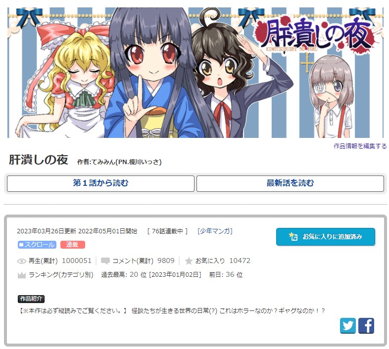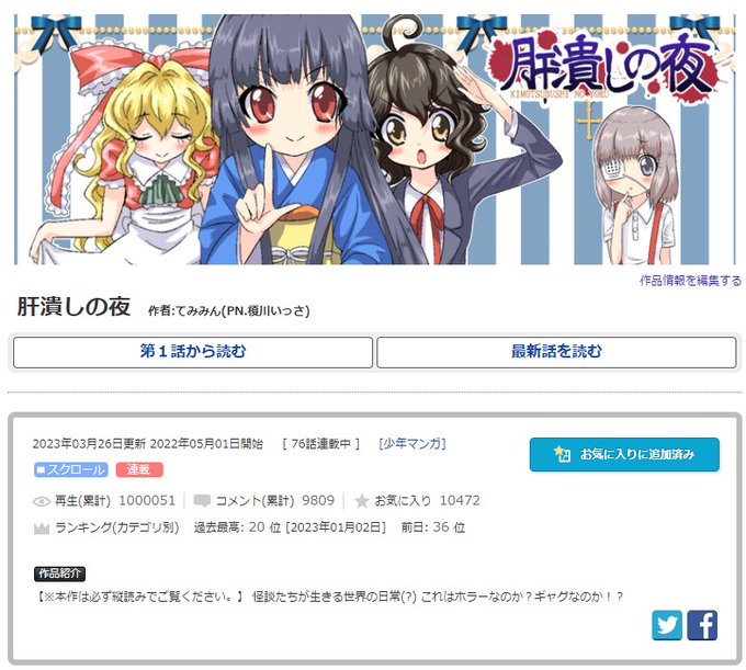 【お知らせ】肝潰しの夜 がもうすぐ累計100話を迎えます!(以下画像をご覧ください!) #肝潰しの夜 ▼肝潰しの夜 PART2 / てみみん(PN.榎川いっさ) seiga.nicovideo.jp/comic/64703 #ニコニコ漫画