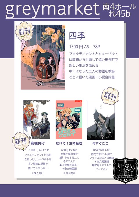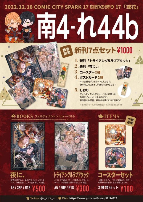 12/18 南4[れ44b] お品書きです 🔶新刊セット(新刊2冊、コースター2種、ポストカード2種、しおり、の7点セット) ¥1000 🔶夜に、¥500 🔶トライアングル〜 ¥300 🔶コースター2種 ¥100 ※新刊2種とコースターは単品購入可能です ※ポスカ・栞は新刊セットのみでの頒布です #肝胆愛照らす2022