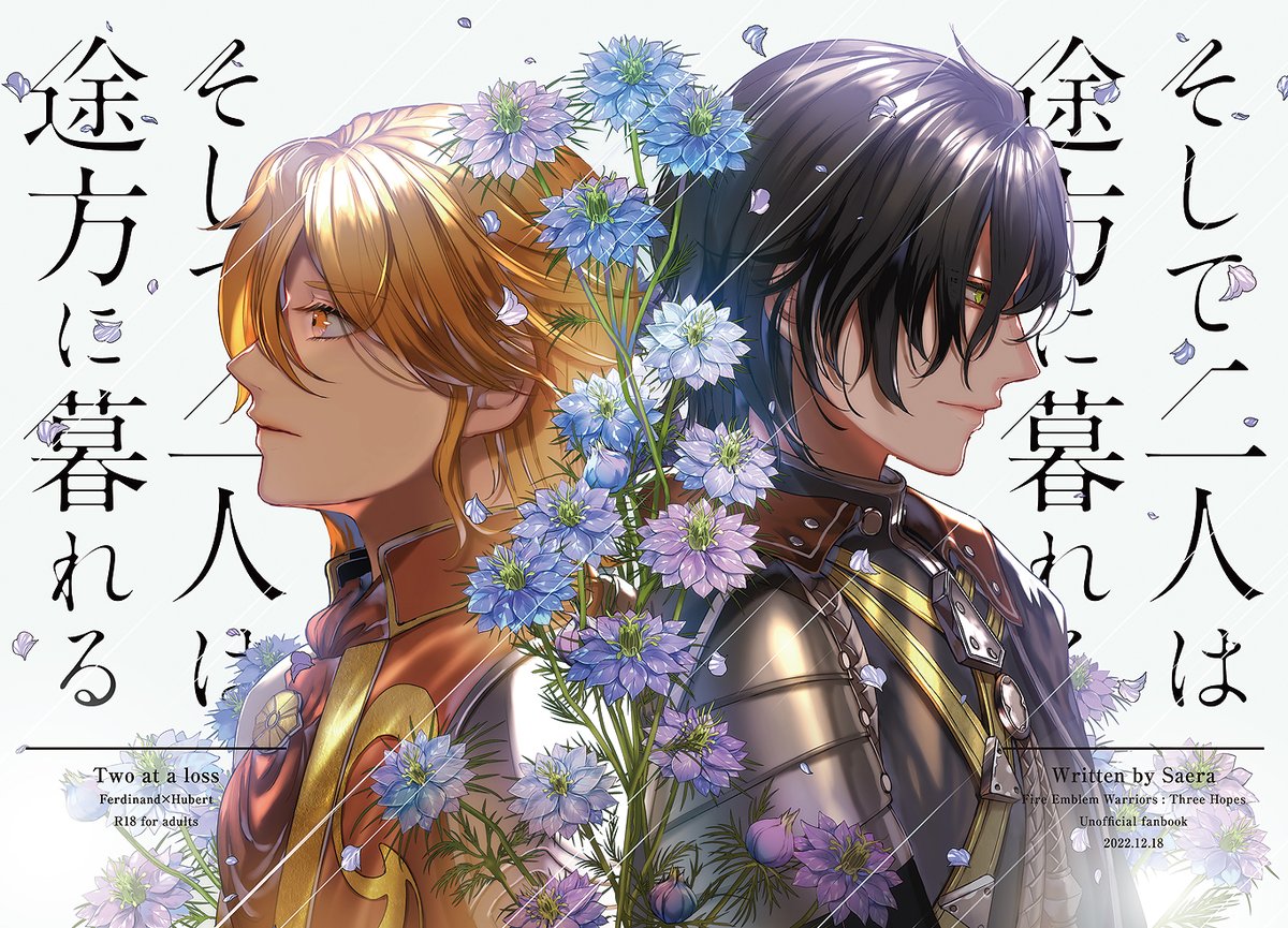 さえらさんの新刊「そして二人は途方に暮れる」の表紙を作成しました。 小説の内容に合わせ、二人の距離感を大事にロゴとイラストを制作しています。 pixiv:pixiv.net/artworks/10331… さえらさんのスペース情報はこちら twitter.com/saera_FE3H/sta… #肝胆愛照らす2022