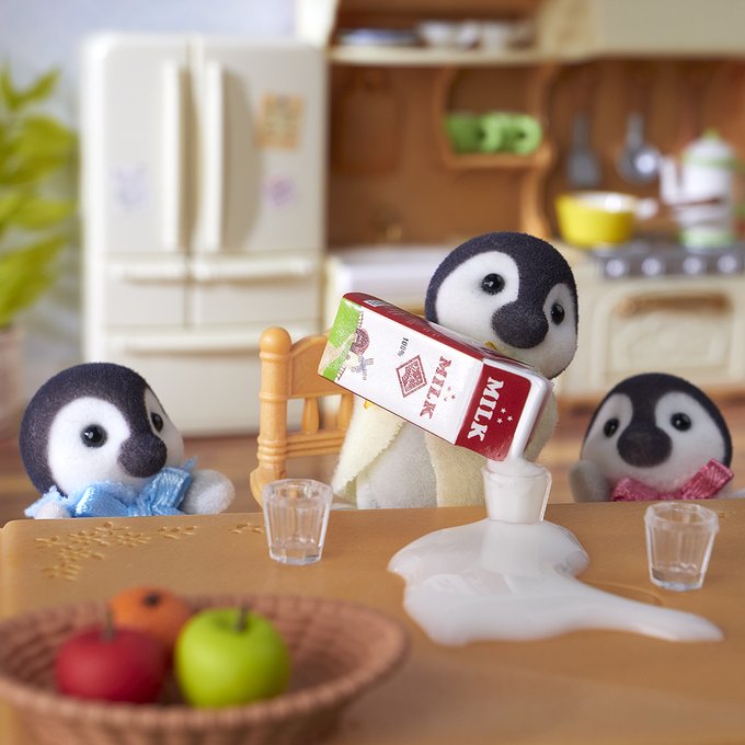 のどがかわいた、ペンギンのキッピー、パール、ロッキー🥛 「ぼくがコップにいれる!」 「はやくー!」 「あ…こぼれた…」 キッピーが注いだミルクがあふれてしまいました💦 「あれ?つぎはうまくいれるね!」 もう一本開けちゃうのかな? #シルバニアファミリー #シルバニア #育児あるある