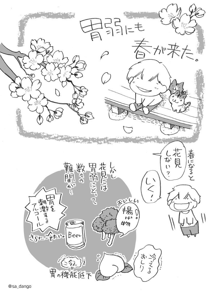 #こんにちは胃弱です ⑧最終話 胃弱にも春が来た 胃弱のお花見 2015年コミティア発表 胃弱の同人誌です よかったら読んでってちょ(埼玉在住名古屋人) 胃弱の方からのメッセージありがとうございます。お互いつらいよね~こまるよね~! #漫画が読めるハッシュタグ #胃 #健康
