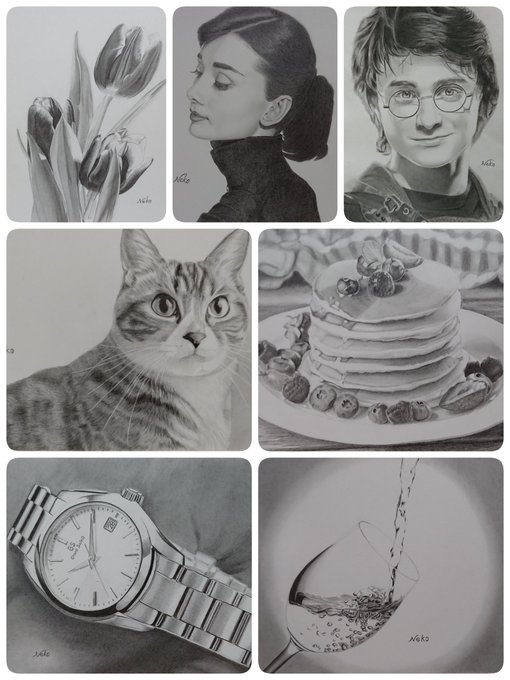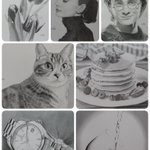 #8月の終わりにあなたの作品見せてください おはようございます(*^^*) 私明日はお休みなので今日一日頑張ります 皆さま素敵な一日をお過ごしください(^^♪ #鉛筆画 #シャーペン画 #模写 #過去絵 #オードリー・ヘップバーン #ダニエル・ラドクリフ #腕時計 #猫 #花 #水 #パンケーキ