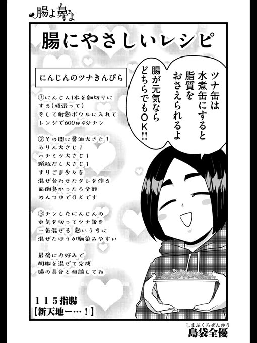 こんばんは!Twitter告知クソ野郎です!!腸よ鼻よ127話がアプリで一般公開されました!首の皮一枚で打ち切りを回避した腸鼻の話です!完結まであと2話!腸にやさしいレシピ掲載は今回の扉絵で最後です、どうぞよろしくお願いいたします~!!!!! #腸よ鼻よ #GANMA! share.ganma.jp/magazines/37b6…