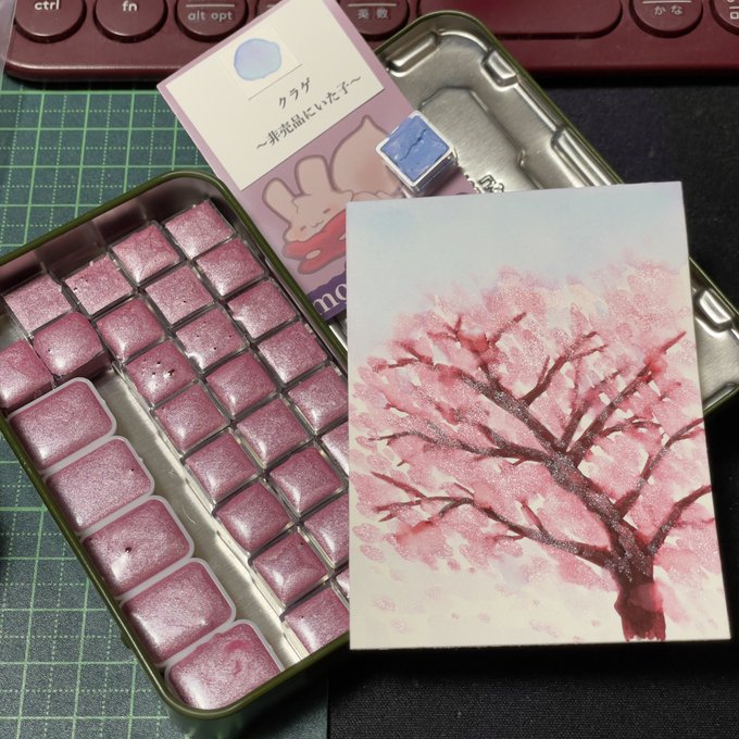 自作の香り付き絵の具"山桜"ともしょさん(@mosho22 )からお迎えした自作絵の具クラゲで春のワンカット描いて見ました٩(๑′∀ ‵๑)۶ クラゲの分離も素敵だし、自作の山桜も緑の偏光ラメがいい味出してて最高だー! 山桜は乾き次第、Boothにて頒布します🙌🏻✨ #水彩絵 #自作絵の具 #ハンドメイド絵の具