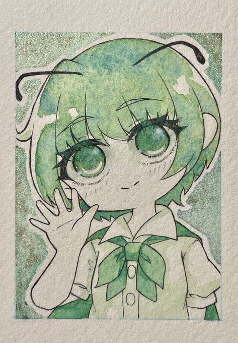 \ウオオオオオ/ リグルちゃんできましたよ‼︎ リハビリ絵にしては良い出来なのでは(っ˘꒳˘c) 肌色以外は自分の自作絵の具で塗ってます💪🏻 #東方Project #リグルナイトバグ #touhouproject #wrigglenightbug #透明水彩 #自作絵の具 #watercolorpainting