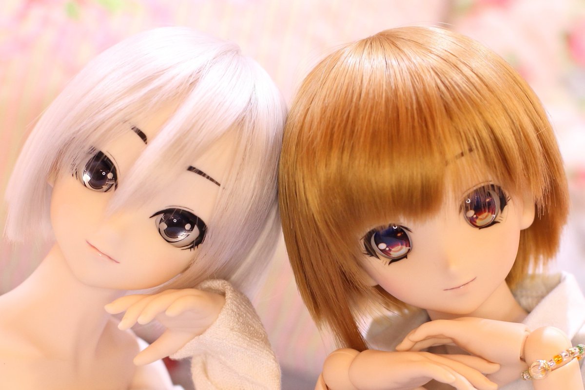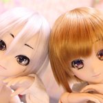 芽結ちゃんと、ココちゃん目がハート❣️ 初めてレジンアイ作りました。 虹彩のデザインはティンクルスター様です。 虹彩のデザインも作れるようになりたいな〜😁 #MDDはいいぞ #obヘッド #自分でメイクしたドールはいいぞ #ドールオーナーさんと繋がりたい #うちのこかわいい