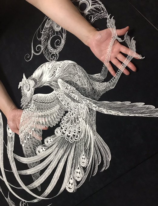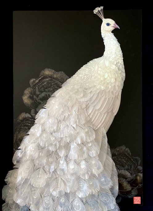 #自分で描いといてアレだけどすごい好き うすうす感づいてると思うけど 慈愛ちゃんはかなり好きなほう 『白孔雀図〜慈愛〜』 2022.3 A2 背景から孔雀までオリジナル技法によるレジンだけで作った半立体額装作品