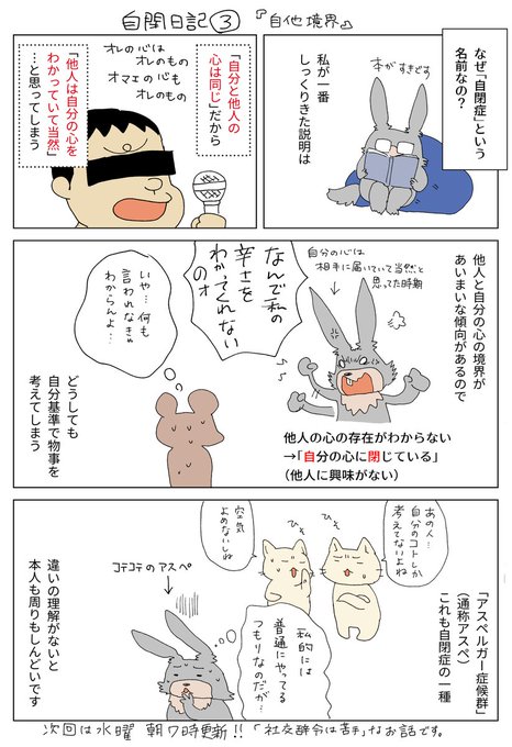 水曜朝7時は #自閉日記 自閉症の要素を持ってる人って実は10人に1人ぐらいなんだそうです。 『違うだけで、劣っているのではない』 私の好きな精神科医、本田秀夫先生@hihojan10の言葉。違いを知って貰えたら、嬉しいです。 次回は「自他境界」について。 #コルクラボマンガ専科 #アスの毎日絵日記