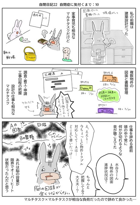 #自閉日記 マルチタスクに弱い事から「育児と設計の兼業が自分に合わない」ことがわかり、正社員を手放したことを悔やんでいた自分が救われた思いでした。 複数物件の設計管理も育児前はそれなりにやれてたのに…育児は脳の容量をかなり食うんでしょうね。 #コルクラボマンガ専科 #アスの毎日絵日記