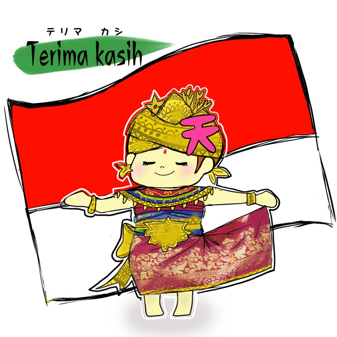 天テンちゃんはインドネシアのバリ島の舞踊の衣装 「パケアン・タリ・バリ」を着ました😄 #インドネシア #バリ島 #舞踊 #イラスト #イラスト好きな人と繋がりたい #絵描きさんと繋がりたい #ゆるいイラスト
