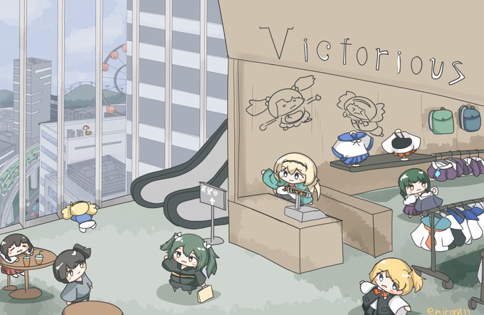 #艦これ版深夜の真剣お絵描き60分一本勝負 #艦これ版真剣お絵描き60分一本勝負_20230625 #舞風 #高波 #ヴィクトリアス みんなでおかいもの! 背景寂しかったからなんとなく書いてたら街になった!