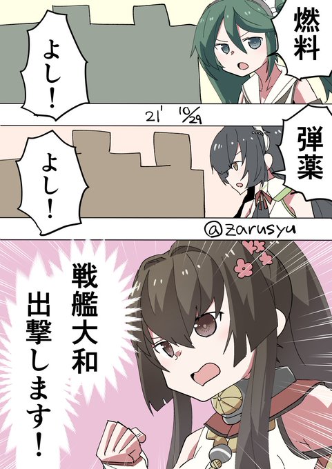長門やネルソンなどのタッチ実装以降は出番が減った大和型ですが、ここぞというときに使用する切り札感はいまだにありますね(一発大破したときの(鋼材的な)絶望感もありますが) 五十鈴、大和、瑞穂 #艦これ版深夜の真剣お絵描き60分一本勝負 #艦これ版真剣お絵描き60分一本勝負_20211029