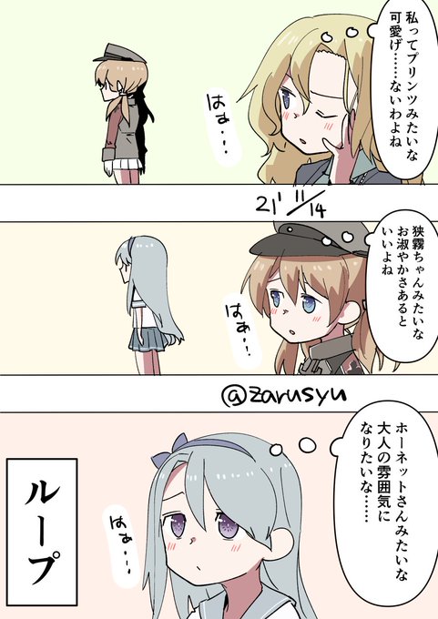 自分の良さを顧みた方が早いのはわかるけど自分では気づかず、隣の芝生が青く見えちゃいますよねぇ プリンツ・オイゲン、ホーネット、狭霧 #艦これ版深夜の真剣お絵描き60分一本勝負 #艦これ版真剣お絵描き60分一本勝負_20211114