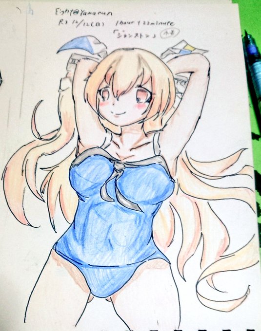 水着ジョンストン描けたー!!ヘ(`・ω・)ノヒャッホー!大遅刻ゴメンナサイ( ;∀;) #艦これ版深夜の真剣お絵描き60分一本勝負 #艦これ版真剣お絵描き60分一本勝負_20211212 #艦これ #ジョンストン