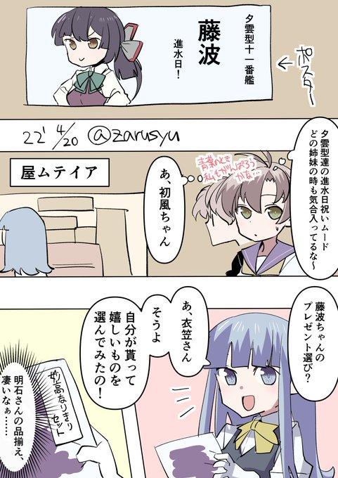 数日おき(あるいは連日)に誰かの進水日お祝いムードで、明石さんはホクホク。 藤波、初風、衣笠 #艦これ版深夜の真剣お絵描き60分一本勝負 #艦これ版真剣お絵描き60分一本勝負_20220420