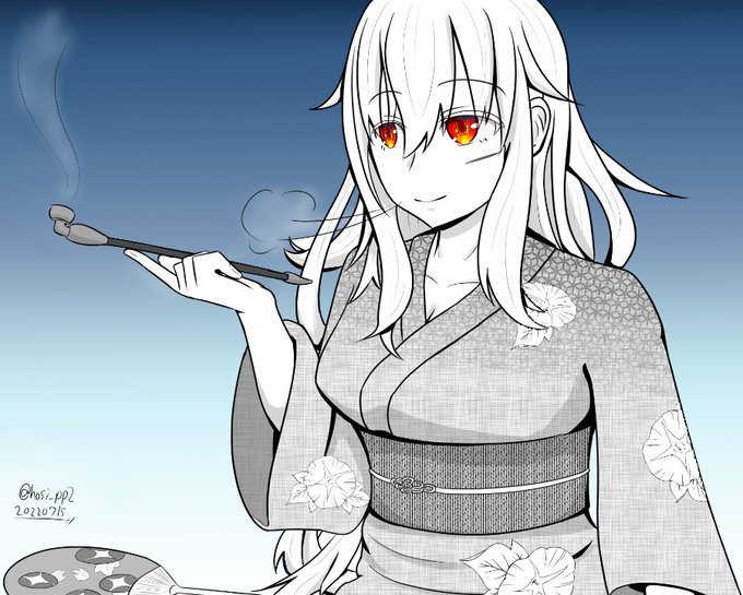 ガングート「たまにはこういうのも悪くないな」 浴衣姿で一服するガングート。水着も良いけど浴衣も良いですよね。 #艦これ版深夜の真剣お絵描き60分一本勝負 #艦これ版真剣お絵描き60分一本勝負_20220715