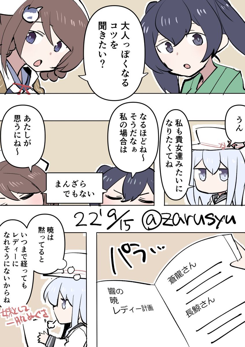 真正面からやると 「すでに暁はレディーよ!」 と反発されそうなので、こっそり計画を進行させる予定 蒼龍、響、長鯨 #艦これ版深夜の真剣お絵描き60分一本勝負 #艦これ版真剣お絵描き60分一本勝負_20220915