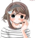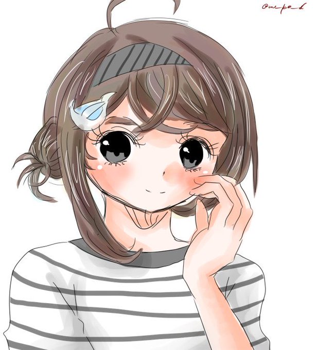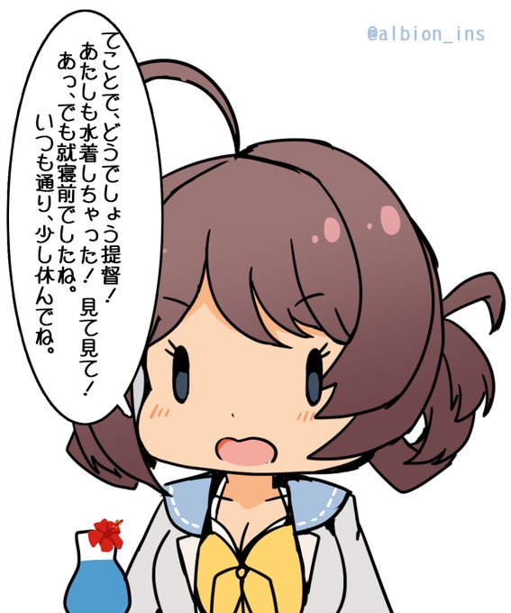 「てことで、どうでしょう提督! あたしも水着しちゃった! 見て見て! あっ、でも就寝前でしたね。 いつも通り、少し休んでね。」 #艦これ版深夜の真剣お絵描き60分一本勝負 #艦これ版真剣お絵描き60分一本勝負_20220915