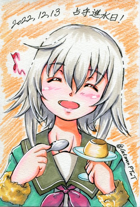 #占守進水日 #艦これ版深夜の真剣お絵描き60分一本勝負 #艦これ版真剣お絵描き60分一本勝負_20221213 プリンだけで幸せそうな占守ちゃん🍮 みんなも幸せにする笑顔 勉強を急いで一区切りさせてでも、思い付いたら描きたくなるなる~💧