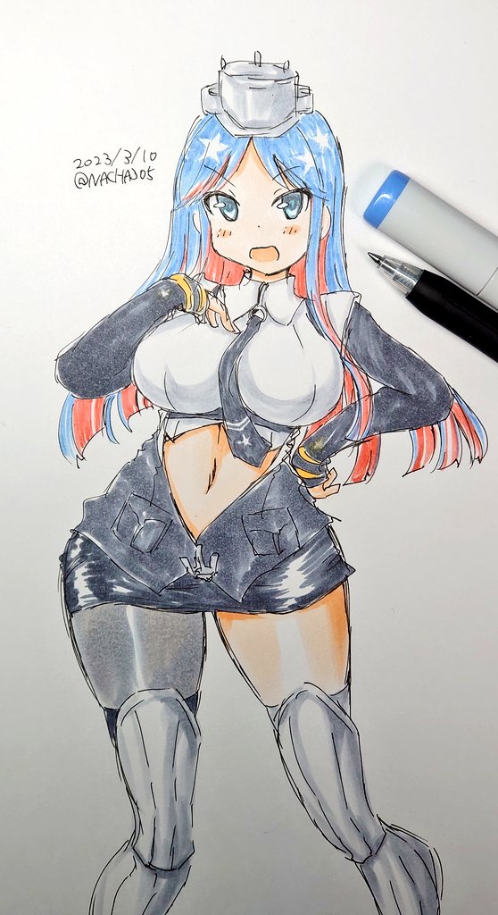 サウスダコタ「提督!なんっで私がMightyよりも後なんだよ!…いや別にこんな格好したかったわけじゃねえけどさ」 お題の順番だっただけで偶然なんだぜ。でもやっぱ仲良いよなお前ら #艦これ #サウスダコタ #艦これ版深夜の真剣お絵描き60分一本勝負 #艦これ版真剣お絵描き60分一本勝負_20230310