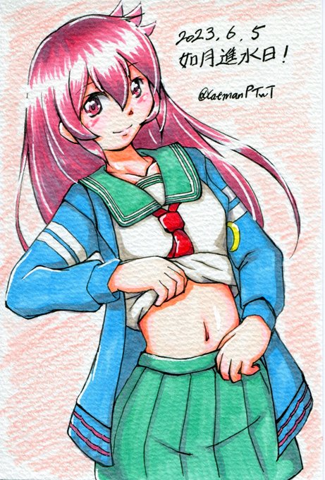 #如月進水日 #艦これ版深夜の真剣お絵描き60分一本勝負 #艦これ版真剣お絵描き60分一本勝負_20230605 如月ちゃんの立ち絵のおへそを見ていたら、「見える」と「見せる」はどっちがドキドキものだろうかと考え込んでしまいました。 結論:どっちも良い