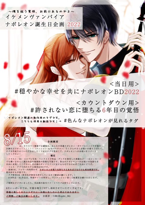 来る8/15はイケヴァンのナポレオンBDです🦅今年もタグ企画を立てました🙏 続編配信もあったので益々盛り上がる事を願って🥳🎉 ★当日用 #穏やかな幸せを共にナポレオンBD2022 ★カウントダウン(CD)用 #許されない恋に堕ちる6年目の覚悟 ★CD、当日とも併用歓迎 #色んなナポレオンが見れるタグ