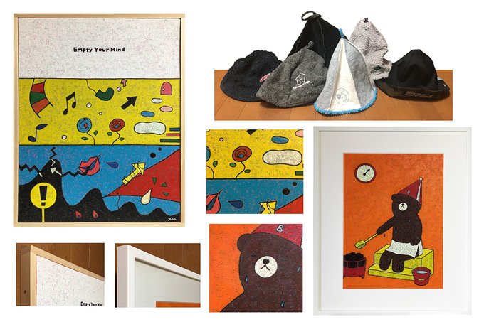 縁個展-after 作品が本日までWEB販売中! 「ととのう」までのプロセスを表現した作品達! そして、たまにプライベートサウナに行く我が家のサウナハットが増殖中! 作品WEB販売📲 artsmarket-official.square.site/shop/yuka/9 会場view📲 theta360.com/s/rKy53D7z59nY… #色プロデュース #イラスト #現代アート