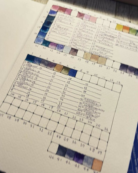 色見本を作り直して一人静かに萌えていました。色を決めずに塗るからほぼ使わないんだけども。作りたいだけ、みたいな。 #イラスト #透明水彩 #水彩 #ペン画 #watercolor #Illustration #drawing #色見本