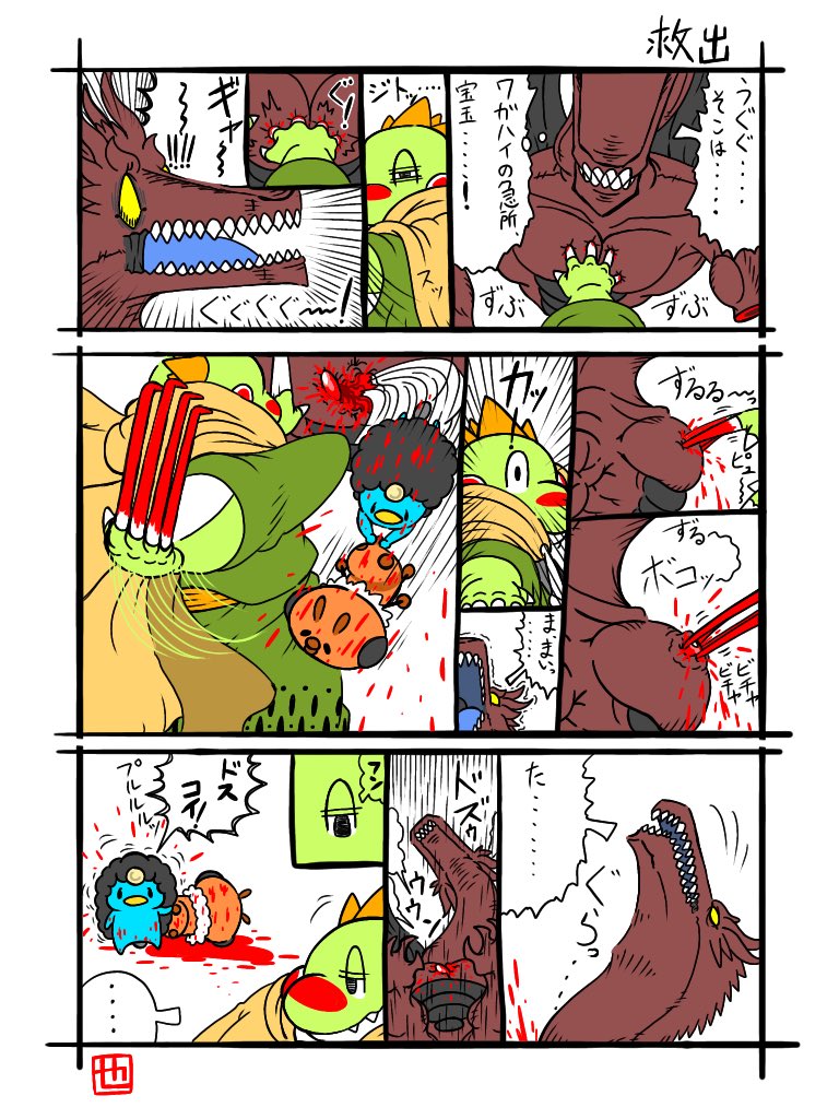 こんにちは!日曜日は時空が歪んでいるのでしょうね。気がつけばもうお昼です。 …ポケモンアルセウスで時空の歪みを見つけた時は嬉しいんですけどね。 #イラスト好きさんとつながりたい #漫画が読めるハッシュタグ #怪獣ベンチ #出血表現注意 #芋づる式