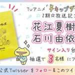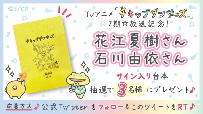🍗フォロー&RTキャンペーン🐸 TVアニメ「#チキップダンサーズ」2期放送記念🎉 #花江夏樹 さん #石川由依 さんのサイン入り台本を抽選で3名様にプレゼント✨ ▼応募は9/1~9/14 ①@chickipdancers をフォロー ②このツイートをリツイート くわしくはこちら▽ san-x.co.jp/blog/toretate/…