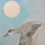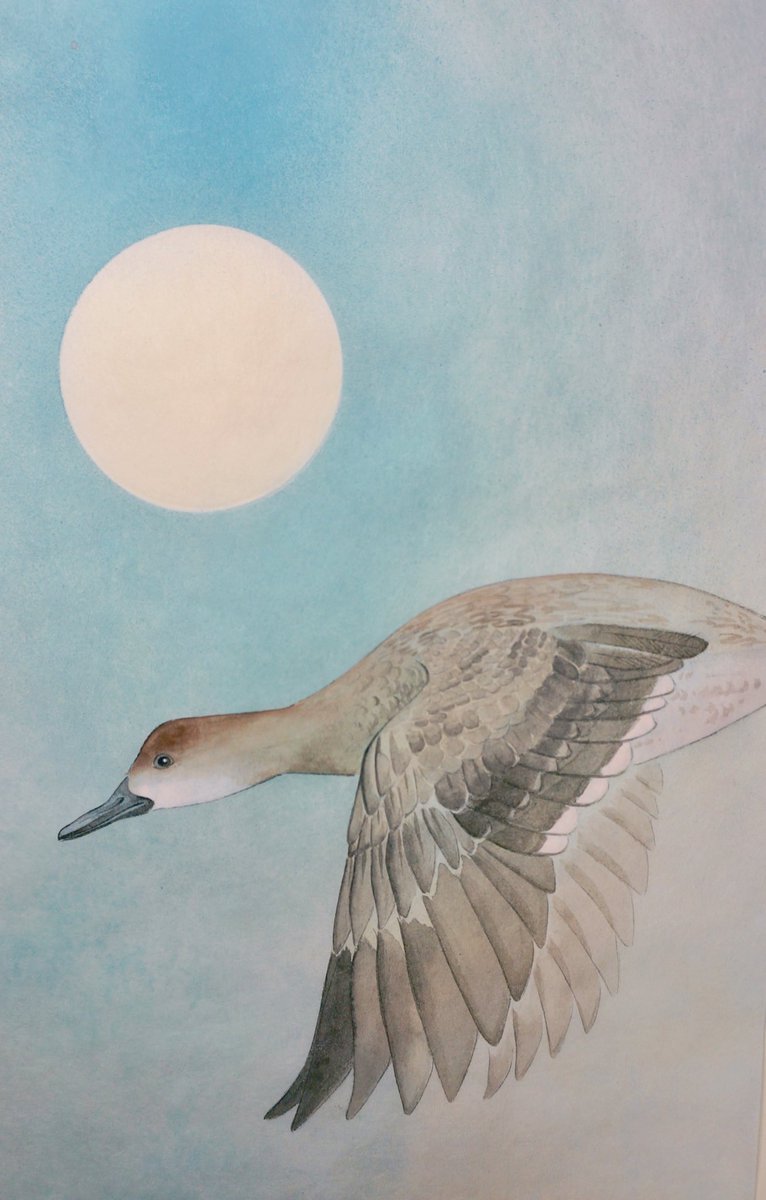 和紙に霧吹きで月を作るのは、やっぱり霧吹きではなく、ぼかし網のほうがいい。 和紙を霧吹きで湿らし、繊維を開いておいてから、ぼかし網と刷毛をつかって月を作った。以前試しで作ったものに、ヨシガモを描いた。 「ヨシガモに月」 和紙に水干、墨。 #日本画 #花鳥画 #絵描きさんと繋がりたい