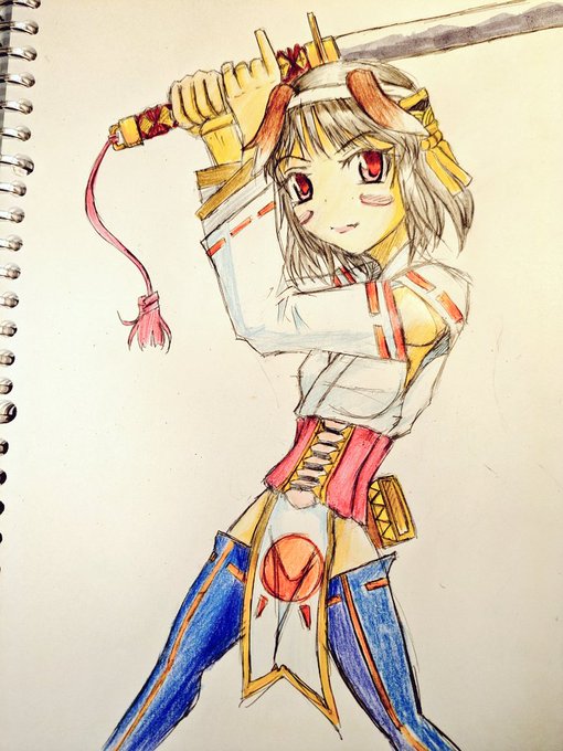 今回のケモミミちゃんは? 鬼退治するクマミミちゃん ちょっとお目々が行ってそうだけど満月だからかも、 くまさん系だけあって力はこの腕だけどあるようです (‘◉⌓◉’) #花maruの絵 #オリジナルキャラクター #ケモミミ #アナログ絵 #日本刀 #鬼退治 #絵柄好みって人いたらいいなぁ